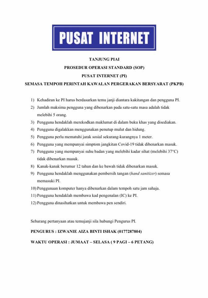Selaras dengan Perintah Kawalan Pergerakan Pemulihan yang telah ditetapkan oleh pihak kerajaan, terdapat beberapa syarat tang perlu dipatuhi oleh para pengguna sekiranya ingin mendapatkan perkhidmatan di Pusat Ekonomi Digital . Para pengguna haruslah mematuhi peraturan dan SOP yang telah ditetapkan seperti :