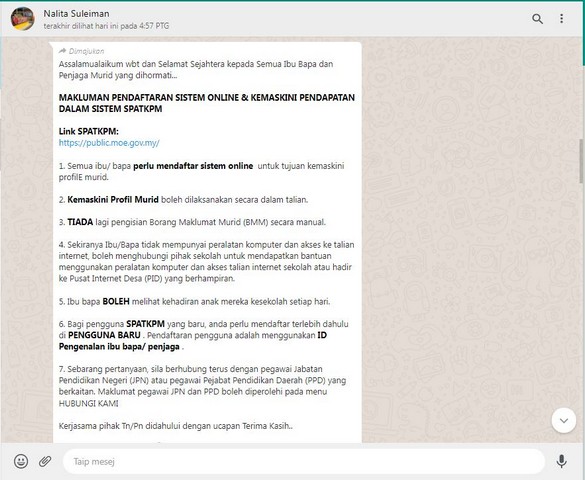 Pendaftaran sistem SPATKPM ini hanya mengambil masa lebih kurang 30 minit sahaja pada hari jumaat bersamaan 7 Januari 2022 pada jam 5.00 petang sehingga 5.30 petang. Apa yang lebih memudahkan beliau ialah pihak sekolah sendiri mengarahkan agar mana-mana ibu bapa agar mengunjungi Pusat Internet yang berhampiran sekiranya tidak mempunyai capaian internet yang baik atau pun tidak mahir mengisi sesuatu borang secara atas talian. Secara tidak langsung membolehkan ahli komuniti yang berdekatan untuk hadir ke PEDi dan menerapkan interaksi yang baik antara pengguna dan kakitangan PEDi. Setelah selesai mendaftarkan sistem SPATKPM untuk Puan Nalita, beliau turut diterangkan mengenai nama PEDi yang menggantikan nama PIK pada sebelumnya serta beberapa penerangan yang lain.