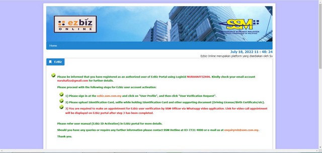 Proses permulaannya adalah seperti biasa dengan mendaftarakan akaun beliau terlebih dahulu melalui Ezbiz SSM. Dokumen peribadi seperti kad pengenalan, lesen memandu, nama emel, penciptaan username dan password serta gambar bersama kad pengenalan turut sama diberikan dalam proses awal pendaftaran. Sesudah itu, beliau dikehendaki untuk membuat janji temu melalui panggilan video bersama pegawai SSM bagi tujuan pengesahan akaun.